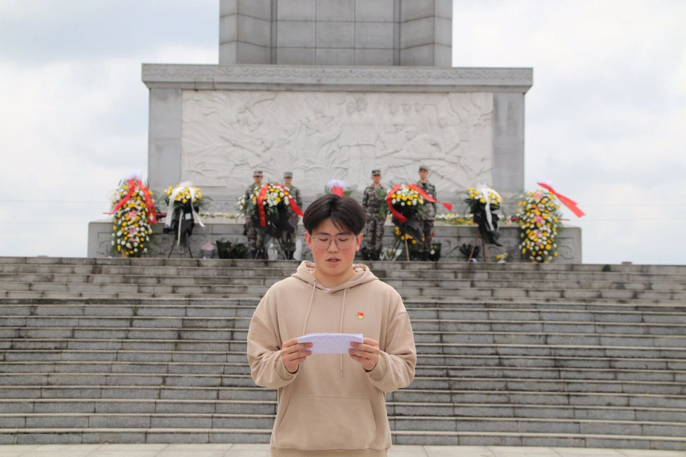 青松翠柏,长空流岚。学院全体学生党员怀着无比崇敬的心情在烈士纪念碑前庄严肃立。伴随着肃穆的《献花曲》,学生代表向烈士敬献花篮,院党委副书记胡锦湘上前整理花篮缎带。研究生第二党支部书记汪亚云带领全体党员重温入党誓词。