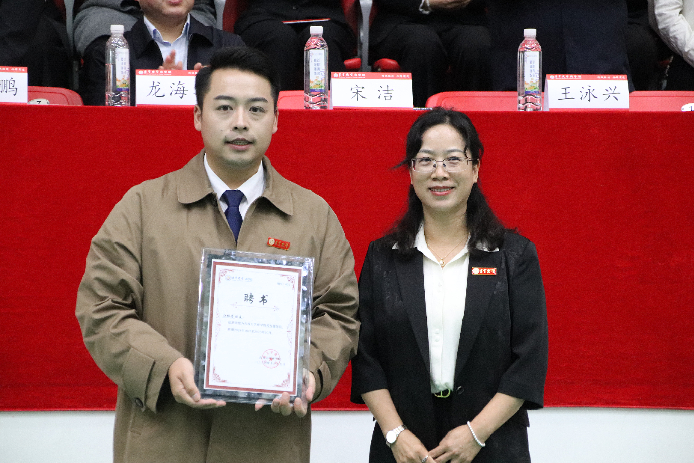 此次入学仪式还特别邀请了在2022年被中宣部评为“金牌讲解员”的2017届校友江杨子。他在入学仪式上分享了自己的成长故事,表达了自己对母院的深厚情感,并寄语学弟学妹,希望他们能做一个脚踏实地、心怀梦想的有心之人;做一个细致入微、全力以赴的用心之人;做一个沉静深思、处处留意的上心之人;做一个知恩图报、心怀善意的知心人。分享结束后,江杨子向学院捐赠了中宣部颁发的“金牌讲解员”荣誉证书、中国共产党历史展览馆讲解员工作证和中国共产党成立100周年纪念徽章。学院党委书记宋洁为江杨子颁发“校友辅导员”聘书。希望新生们能以优秀校友为榜样积极进取、勇于实践。