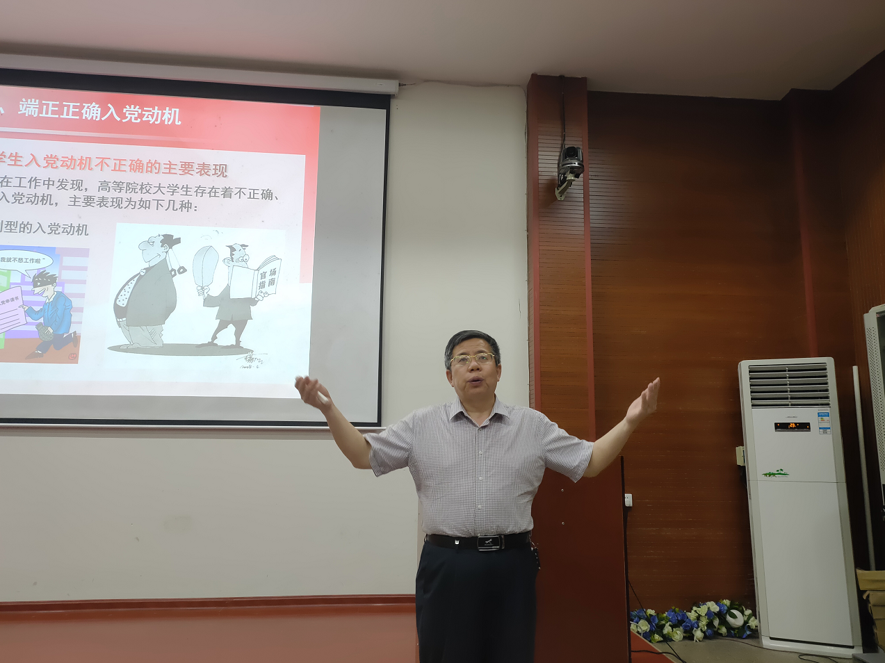 5月29日下午,湖南优秀党校教师石维海结合自身经历,详细叙述了党的指导思想、性质和宗旨;马克思主义学院教授廖胜刚则结合时事,介绍了中国共产党伟大、正确、光荣的原因。