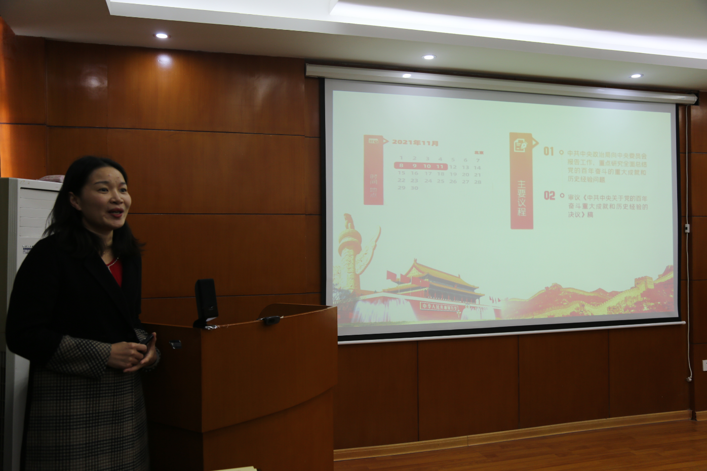 廖金香从深刻领会我们党百年奋斗的伟大成就,更加坚定实现中华民族伟大复兴的信心;深刻领会我们党百年奋斗的伟大意义,更加自觉担起共产党人的历史使命;深刻领会我们党百年奋斗的伟大历史经验,更加重视从中汲取奋进新时代征程的智慧力量三个方面对党的十九届六中全会精神和《中共中央关于党的百年奋斗重大成就和历史经验的决议》进行了详细解读。