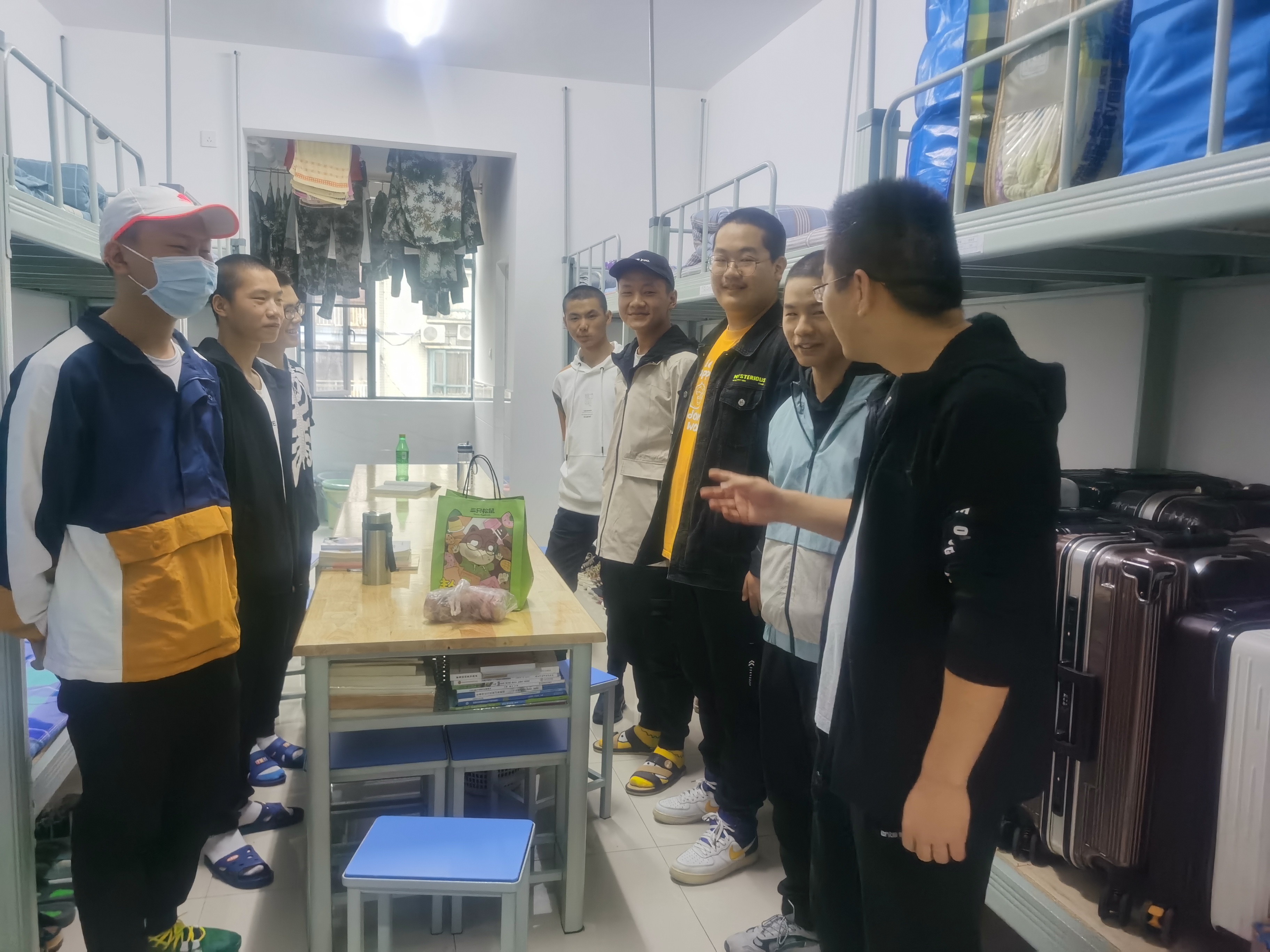 在下寝的过程中,领导、老师全方位了解了同学们在学校的适应情况和寝室的卫生情况,并叮嘱同学们在这个特殊时期要多加注意身体,宿舍要勤通风,防止感冒。最后,领导和老师们为大家送上了节日祝福。