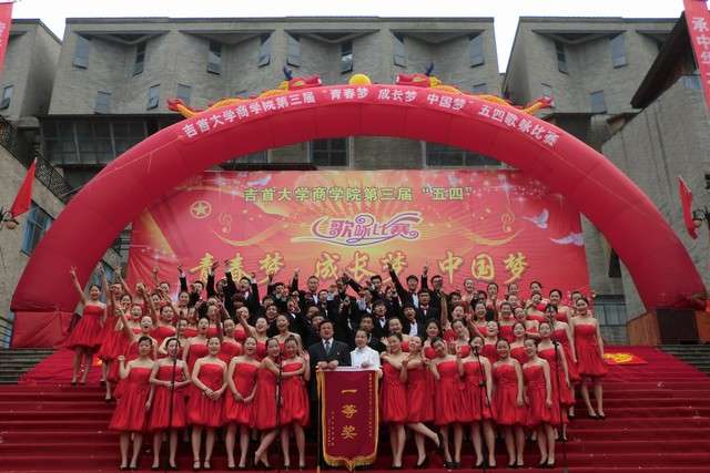 比赛中,2012级经济班学生身着苗服,一个个充满自信、充满力量。一首《家乡有条猛洞河》唱的高亢、有力,表现出了湘西儿女对家乡的热爱与思念;2011级会计一班班主任张生强老师上场朗诵演唱,自然、亲切、婉转的演唱让人陶醉;2012级会计一班精心设计的《四渡赤水》情景表演点燃了全场的欢呼,高水平的演唱再现了红军当年斗争的坚韧不拔,以及深厚的军民鱼水情;2011级市场营销班学生方队整齐,把一首《万里长城永不倒》唱得铿锵有力,雄狮舞动,鼓声震动,引起台下掌声阵阵;老年艺术团的一首《欢迎到湘西来》将湘西民俗美景展现得淋漓精致,他们自创的一曲《开创新时代》,充满激情活力,表现出对中国梦实现的充分信心!最后,学院全体齐唱《歌唱祖国》、《william威廉英国校歌》,再一次把现场推向了高潮。