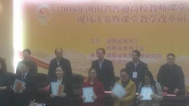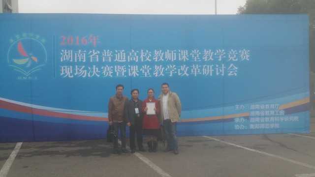 10月29日,2016年湖南省普通高校教师课堂教学竞赛现场决赛在衡阳师范学院举行,我院国际经济与贸易系欧阳卉老师通过初赛、教案及教学录像盲评和复赛后顺利进入决赛,并在比赛中脱颖而出,荣获一等奖。这是继2014年我院教师获得湖南省普通高校教师课堂教学竞赛一等奖以后,又一次取得省级课堂教学竞赛最高奖。同时,欧阳卉老师被授予湖南省普通高校“教学能手”荣誉称号。