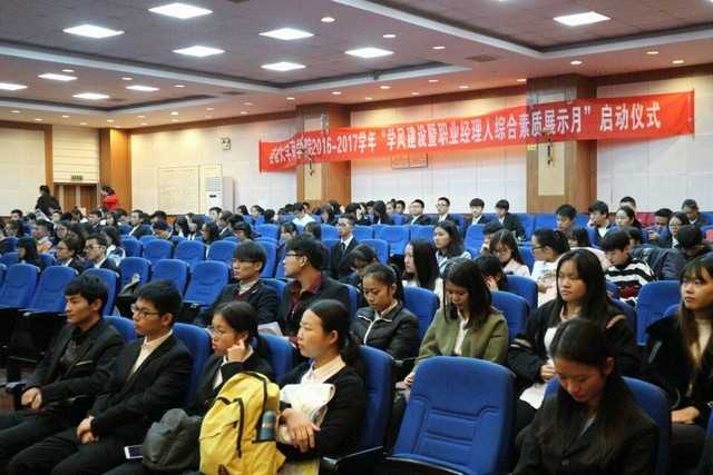 本网讯(罗思雨)10月31日,我院“学风建设暨职业经理人素质展示月”启动仪式在总理楼模拟法庭举行。院党委书记黎克双,副书记钟高峥,院长助理龙海军,院学工办主任兼16级辅导员胡锦湘,院办公室主任王泳兴,各年级辅导员老师,团总支学生会全体成员以及各班班长、团支书、学习委员和生活委员参加了仪式。