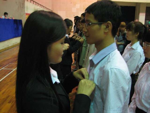 在佩戴校徽仪式上,学院老生代表身着象征着职业经理人的职业装,队伍整齐划一,面带笑容地为2013年专升本新生和2013级本科新生逐一佩戴校徽。“学弟(妹)好”、“Williamhill中文欢迎你”、“希望我们成为朋友”,老生一句句温馨的话语,让新生倍感温暖。戴上校徽的那一刻,新生倍感自豪,也在心中铭刻下了“以人名校、以业报国”的校训。老生为新生佩戴校徽,不仅体现了老生对新生的热烈欢迎,更加体现了学院文化的传承和发扬。