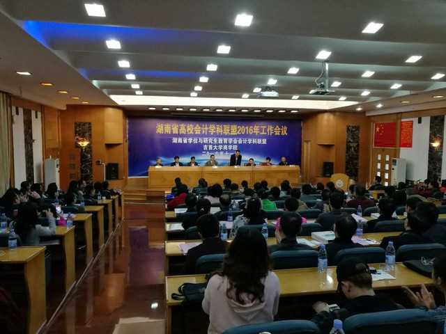 11月5日,由湖南省学位与研究生教育学会会计学科联盟主办、我院承办的湖南省高校会计学科联盟2016年工作会议在我校图书馆学术报告厅举行。湖南省学位办主任余伟良、广州大学校长魏明海、《会计研究》杂志编辑部主任刘国强、中山大学南方学院会计学院院长卫建国、湖南省学位与研究生教育学会会计学科联盟理事长、湖南大学工商管理学院副院长龚光明和全省22个高校近70名嘉宾出席会议,我校校长白晋湘在大会上致欢迎辞,副校长李定珍以及我院会计系全体教师、部分研究生和本科生参加了本次会议。开幕式及上午会议议程由院长田宇主持。