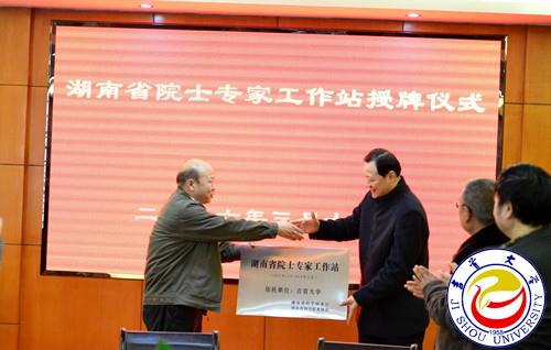 郭昊授予我校“湖南省院士专家工作站”牌匾,校长白晋湘代表学校接牌。