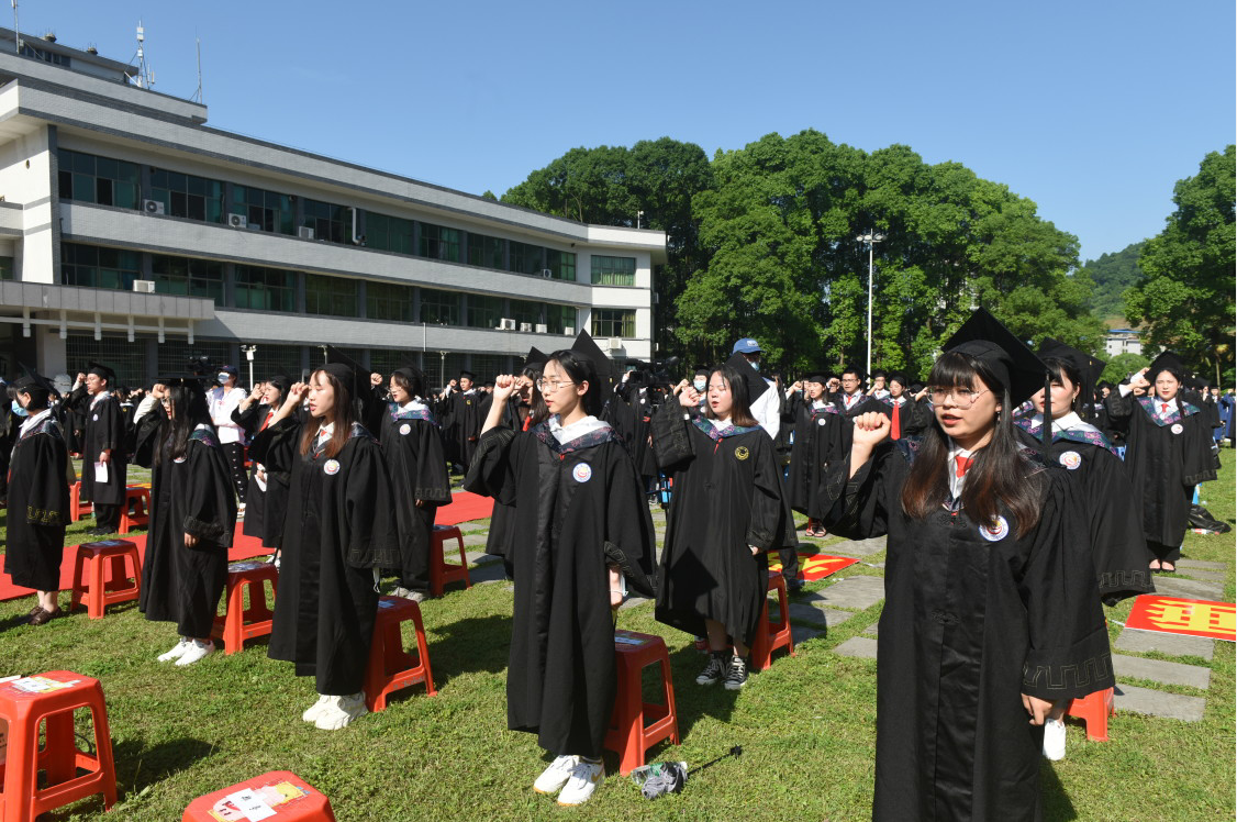 在诵读毕业誓词环节,学院2021届全体毕业生在毕业研究生代表邱晔的带领下,高举右拳,集体诵读《Williamhill中文毕业誓词》。
