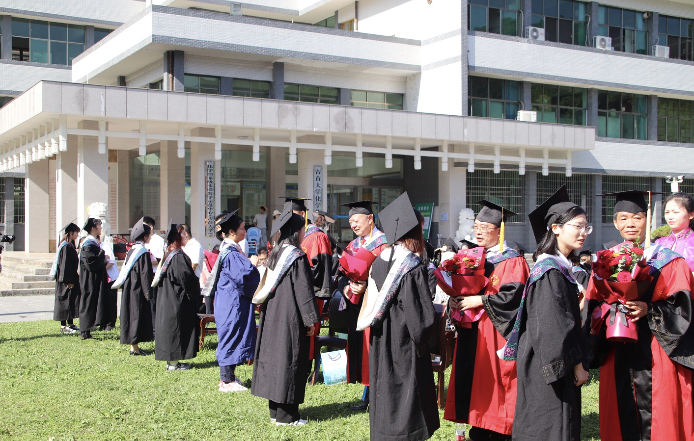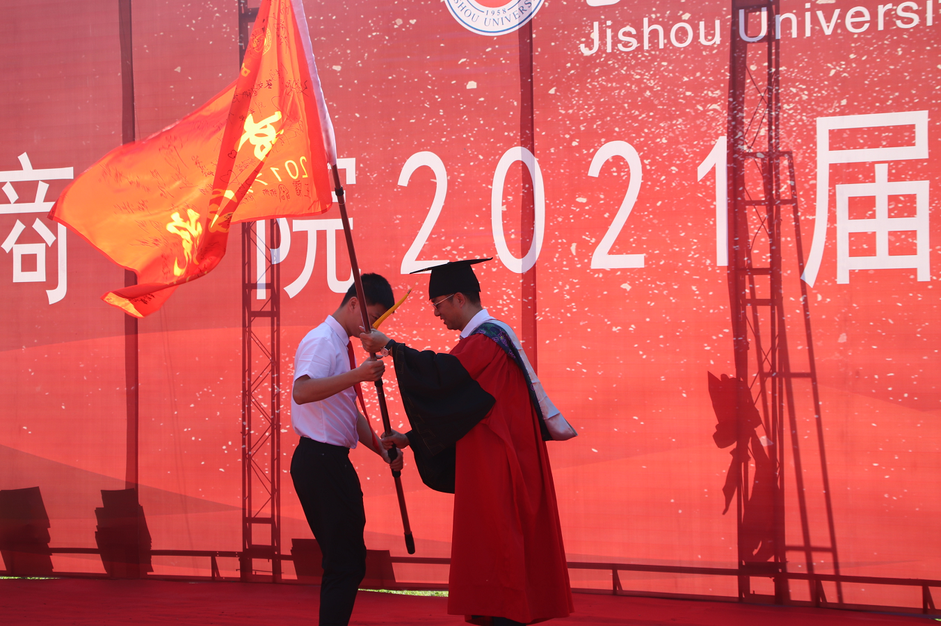2021届毕业研究生、本科生代表向各位主礼教授和班主任敬献鲜花。