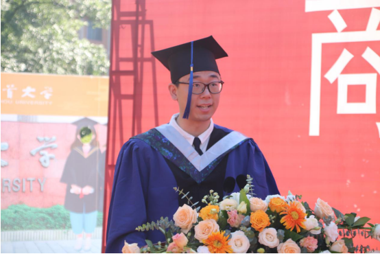 2021届硕士毕业生代表王璋发言。他回顾了在学校求学期间的点点滴滴,表达了对老师与同窗的诚挚感谢,表示在今后的学习工作生活中,将始终铭记校训和院训,不断提升自我,以实际行动回报母校和祖国。