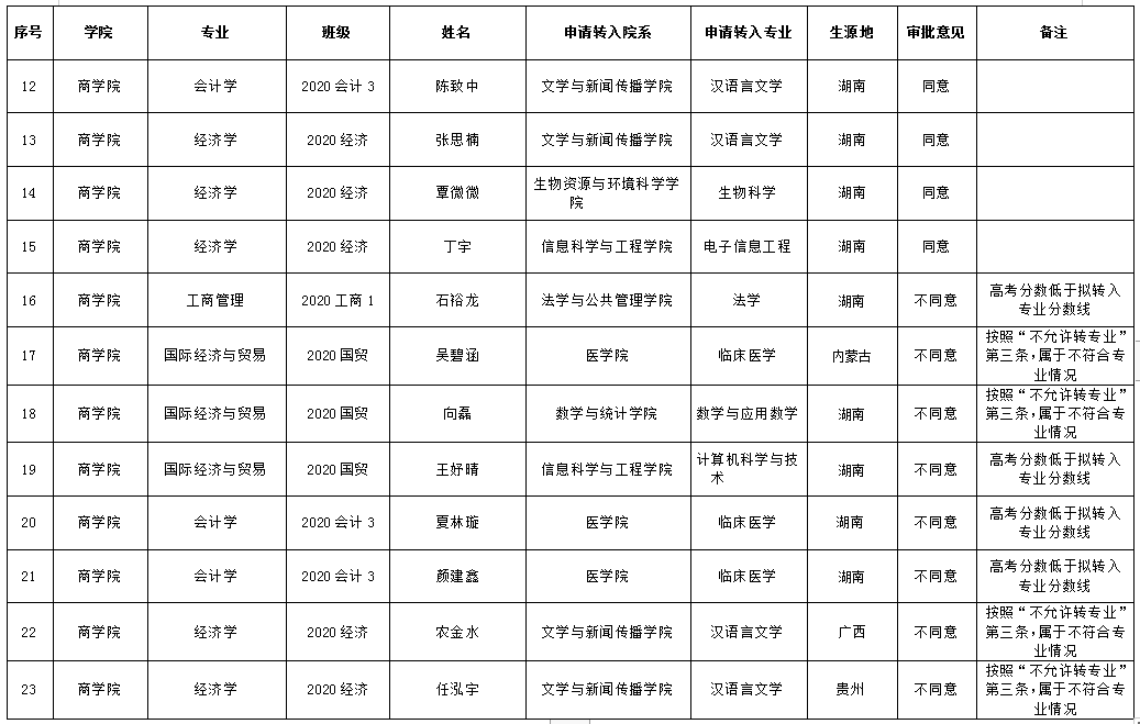 根据《william威廉英国本科生转专业管理办法(试行)》、《william威廉英国本科学生学籍管理规定》(吉大[2019]38号)、william威廉英国《关于做好2020级新生转专业工作的通知》(吉大教通[2020]41号)及《2020年Williamhill中文本科学生转专业工作方案》等相关文件通知的精神,在学生申请、教务办审核,经学院党政联席会研究,拟同意努尔比亚·吐合提库尔班等15名学生转出,现将拟同意转出学生名单予以公示(具体名单附后)。