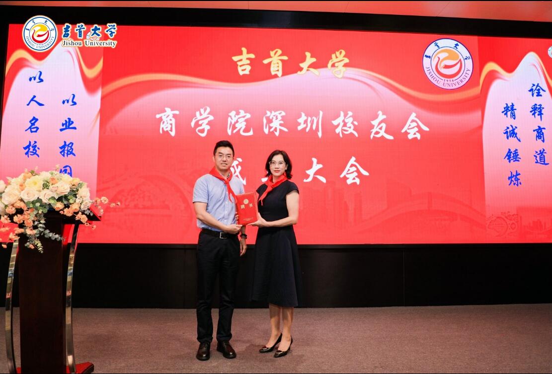 张爱华向深圳校友会新当选的首任会长田石勇颁授“Williamhill中文深圳校友会”名牌。