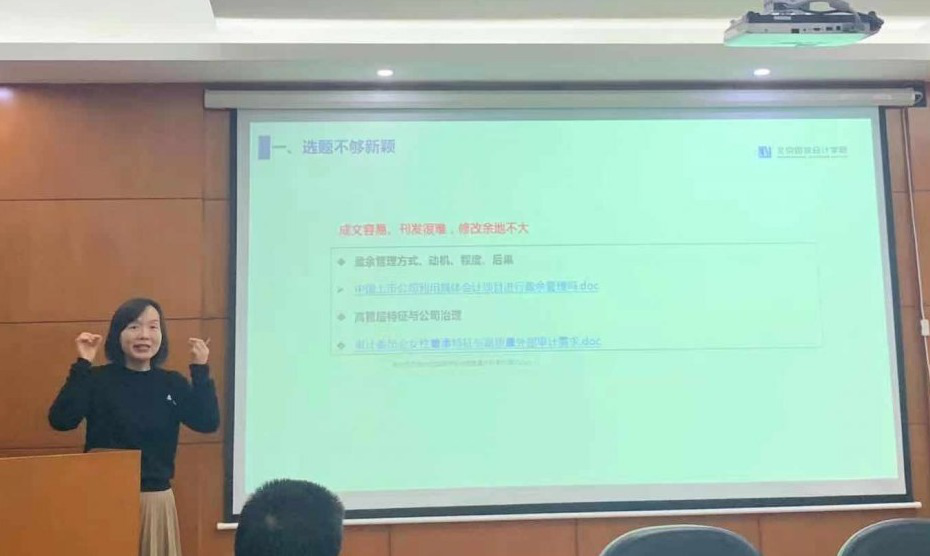李英教授首先从新时代新实践的背景下,讲解了会计论文写作的选题。李教授表示,写作选题能落实到国家政策,能落到实处,指导实务工作才是论文的真正意义。同时好的文章具有一定的标准,李英教授从创新、科学、实用与可读几个方面为大家展示了一篇好文章应做到的要点。随后,许多同学对期刊论文的发表流程存在疑问,李英教授为大家梳理了期刊发表的审稿流程,并对退稿问题进行了详细剖析,主要从选题、文献、理论、文章适用性与问题导向不清晰等方面分析了退稿具体原因。最后应大家的热情请教,李英教授从了解期刊背景、分析期刊发文目录、关注征稿动态、选题避免敏感问题等几个方面为大家分享了如何提高论文投稿命中率。李英教授表示,会计理论研究的未来应做到研究主题中国化、研究范式规范化、研究生思路三大融合这三大点,而研究思路三融合应做到理论与实践相融合、业务与财务相融合、会计与科技相融合。
