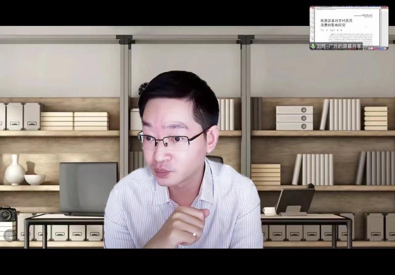 2023年10月17日下午,广州外语外贸大学经济贸易学院刘胜博士受邀参加我院举办的“风雨湖大讲堂”学术沙龙,为大家带来主题为“中国财税理论与政策研究”的学术讲座。本次讲座采取线上形式,由院长丁建军及学院龙安娜博士共同主持,全体研究生新生参加了本次线上讲座。