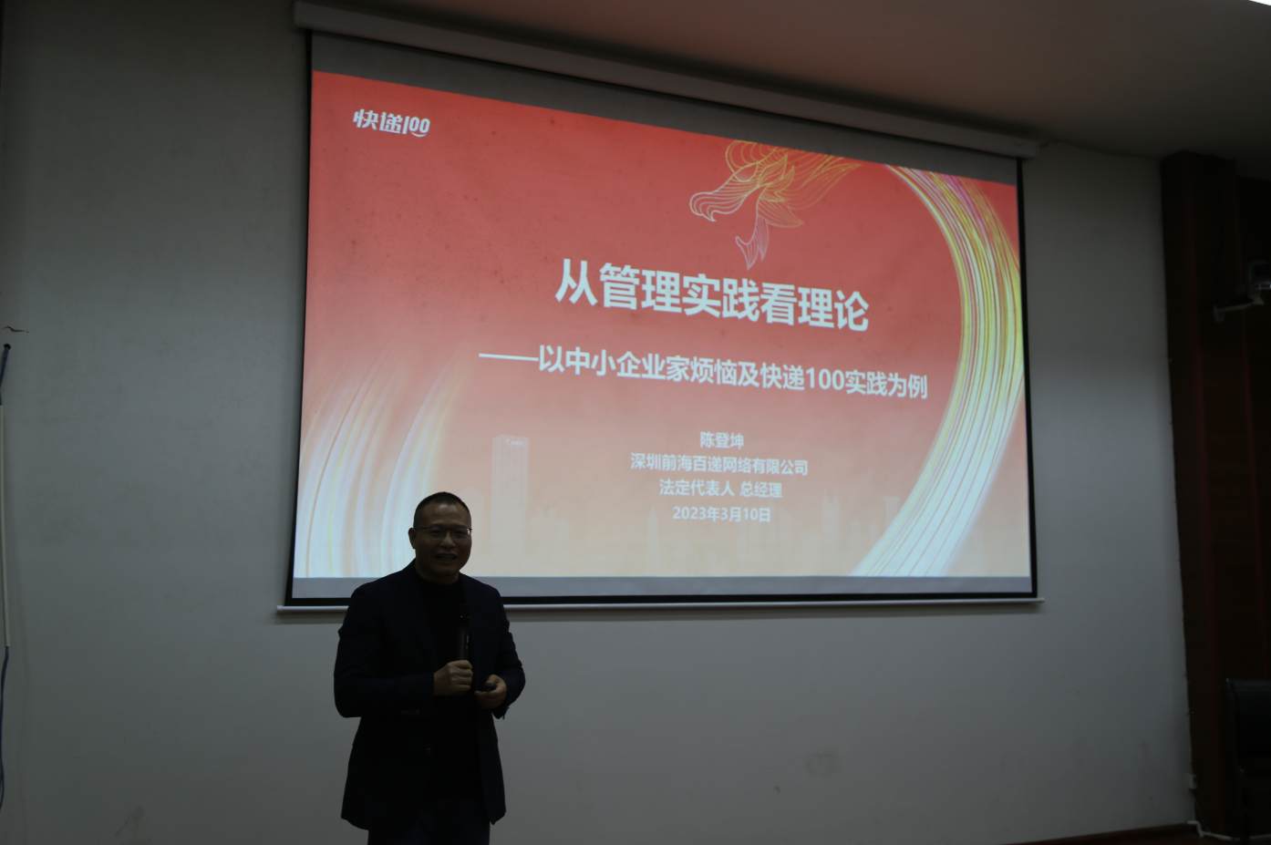 3月11日,深圳前海百递网络(快递100)有限公司总经理陈登坤应邀来学院,在学院学术报告厅为学院师生开展主题为《从企业实践看管理理论》的讲座,本次讲座也是学院“风雨湖大讲堂”第102期活动。讲座由院长丁建军主持,校党委委员、副校长冷志明,学院党委书记宋洁以及学院师生120余人参加了本次讲座。
